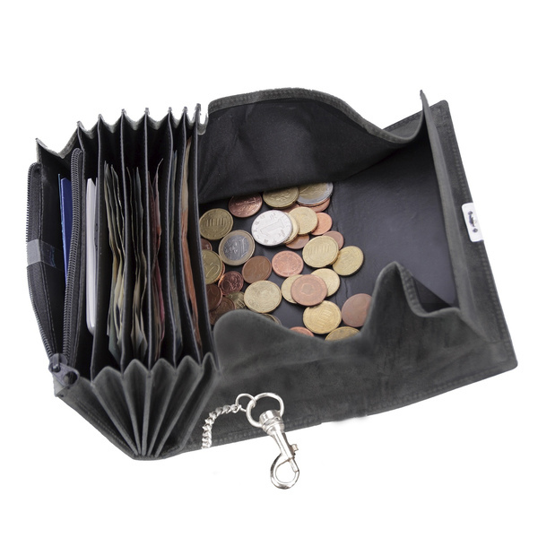 Kelnerportefeuille met zes opbergvakken voor biljetten, portemonnee, compartiment met ritssluiting, compartiment aan de achterzijde met instelbare sluiting met 3 posities. Buitenmaat ca. 18,5 x 9,5 cm.