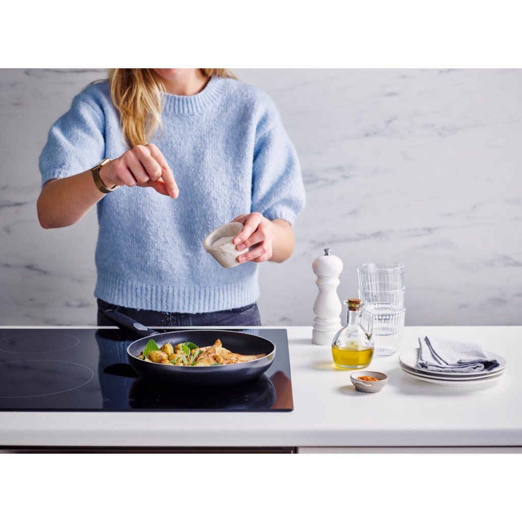 - Uitstekende antikleefeigenschappen dankzij de sterke keramische coating. Slechts weinig vet nodig om uw groenten, vlees en vis te bakken.