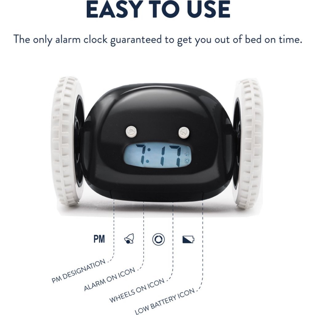 Clocky, de ultieme wekker voor diegenen die zich nooit meer willen verslapen! Deze onverschrokken wekker gaat de strijd aan met ochtendmoeheid en snooze-afhankelijkheid. Het is de perfecte wekker voor diegenen die moeite hebben om ’s ochtends op te staan. Wanneer de ochtend aanbreekt en de verleiding van de snooze-knop te sterk wordt, staat Clocky klaar om actie te ondernemen. Als je nog slaapt, springt Clocky van je nachtkastje en begint hij piepend over tapijt of hout te rollen. Geen genade voor de snooze! Hij is vastbesloten om je op tijd wakker te maken. Deze wekker is ongelooflijk duurzaam en kan zelfs springen vanaf een hoogte tot 3 meter. Clocky produceert een robotachtig geluid dat je niet kan negeren. Clocky heeft de optie om één keer te snoozen als je dat echt nodig hebt. Maar we raden aan om dat met mate te doen, want Clocky zal niet aarzelen om opnieuw in actie te komen. Er zit een optie op om de wielen uit te zetten. Clocky blijft dan op zijn plaats staan en zal niet wegrollen. Clocky werkt op 4x AAA batterijen (niet inbegrepen). Kleur: zwart.