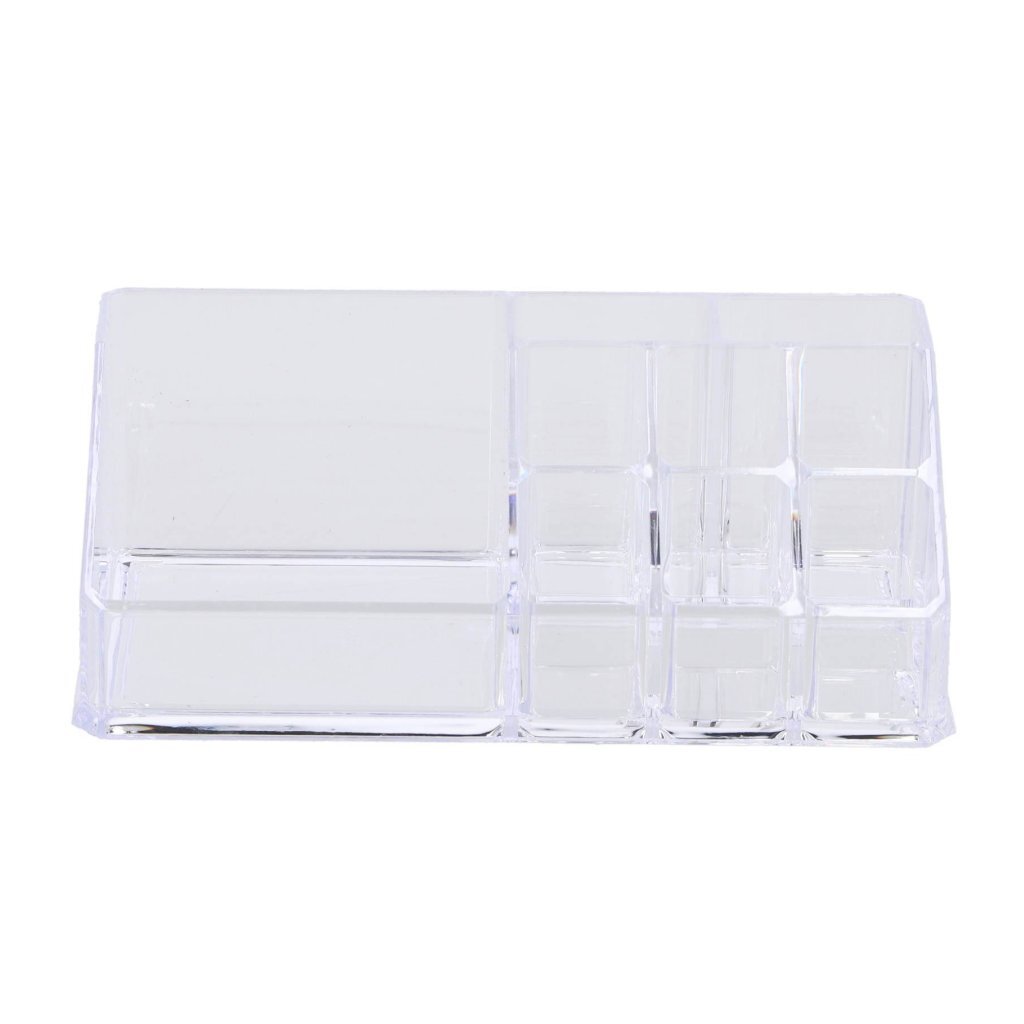 Een transparant cosmetica opbergbakje met diverse vakken voor het opbergen van diverse make-up producten. Afmetingen: 17,5 x 9,5 x 6,5 cm.