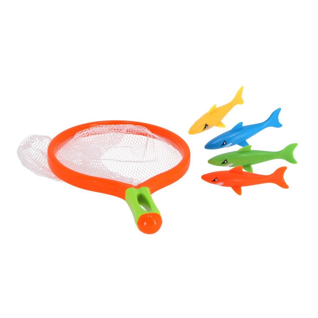 Leuk duikspeelgoed bestaande uit een handig netje en 4 gekleurde haaien. Laat de haaien in het water, spring er achter aan, en probeer ze allemaal te vangen in je netje. Geschikt voor kinderen vanaf 6 jaar. Verkrijgbaar in verschillende kleuren. U kunt niet kiezen, maar ontvangt een willekeurige kleur.