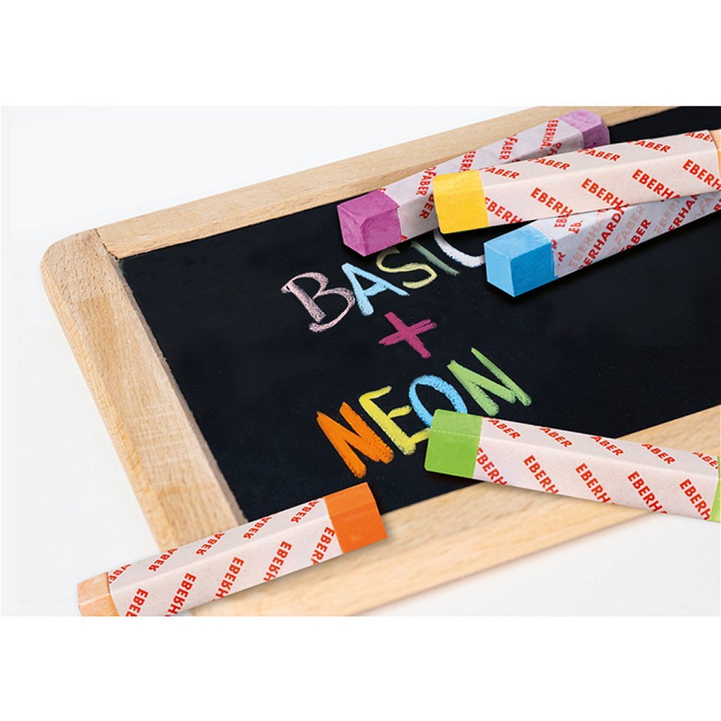 Bordkrijt voor thuis en school. Zand- en stofvrij. Gemakkelijk uit te vegen. Voorzien van een papieren banderol om de vingers te beschermen. Deze set wordt geleverd met 6 neon kleuren en 6 standaard kleuren. Vorm: vierkant.