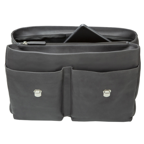 Aktetas met verstelbare, afneembare schouderriem, draagriem, vak met ritssluiting achterin, trolleyriem, twee voorvakken onder de klep. Binnen: hoofdvak met gewatteerd laptopvak, extra hoofdvak met telefoonhoesje en ritsvak, vak met rits in het midden. Binnenmaat 24x37x4cm.
