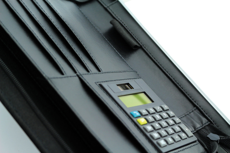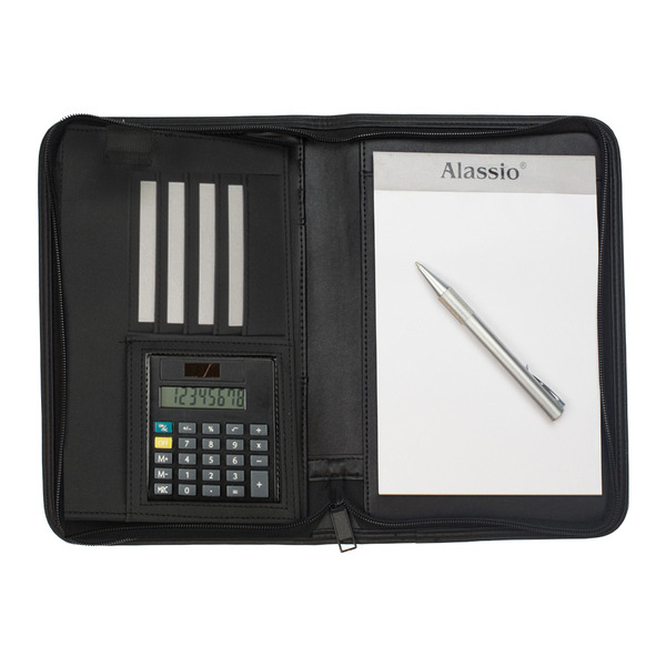 Kunstlederen organiser Alassio Corniglia A5 zwart voorzien van 4 visitekaarthouders, 2 pennenhouders, rekenmachine en schrijfblok A5. Geheel afsluitbaar met ritssluiting. Afmeting 24x18x3,5cm.