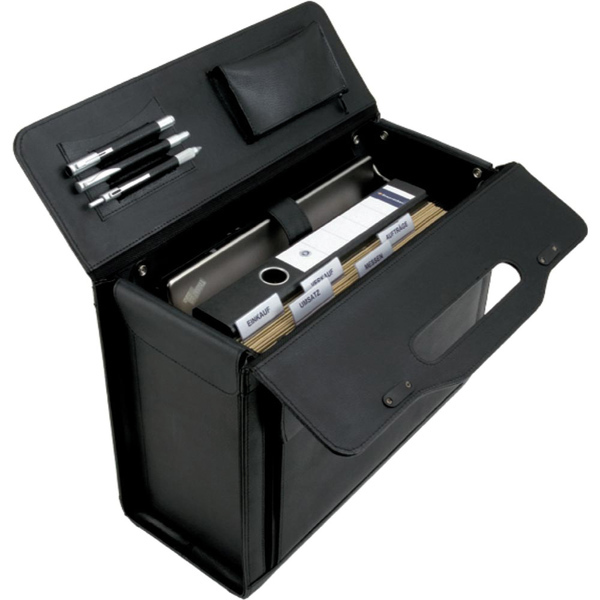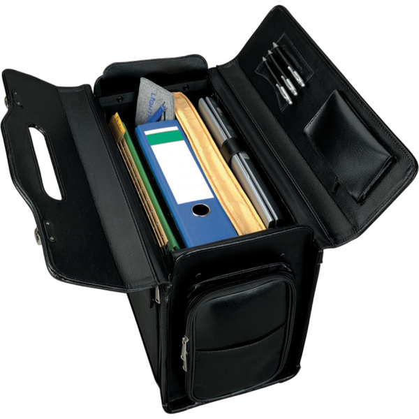 Pilotenkoffer Alassio Verona echt leer zwart. Met groot hoofdvak, twee combinatie sloten, compartiment met ritssluiting en drie pennenhouders in het deksel, een zijvak. Formaat 34,5×45,8×21,5cm.