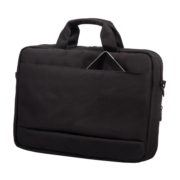 Zwarte laptoptas van gerecycled PET. Achterkant met groot inschuifvak. Met trolleyband, afneembare schouderriem, gewatteerd laptopvak (tot 17″)en voorvak met 3 insteekvakken. 3 visitekaartenvakjes en 2 pen/stiftlussen.