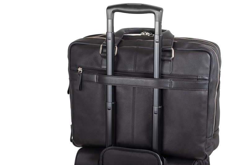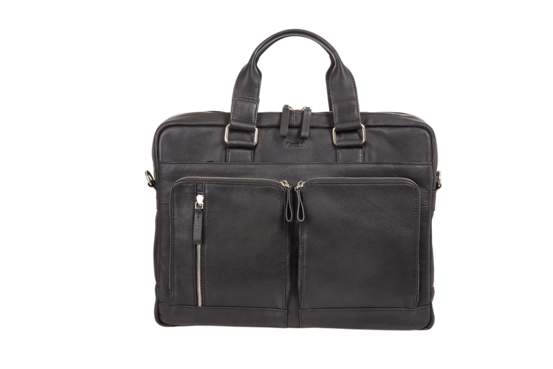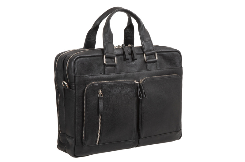 Aktetas CAMPO regelbare en afneembare schouderriem, twee handvaten, twee hoofdvakken met rits, vooraan compartiment met rits, twee compartimenten met rits vooraan, bijkomend opberg vak met rits, op de achterzijde compartiment met rits, riem voor trolley, binnenin: gevoerd laptop compartiment, een opberg vak, compartiment met rits, en opberg vak voor mobiel. zwart leer ca. 31 x 42 x 15 cm
