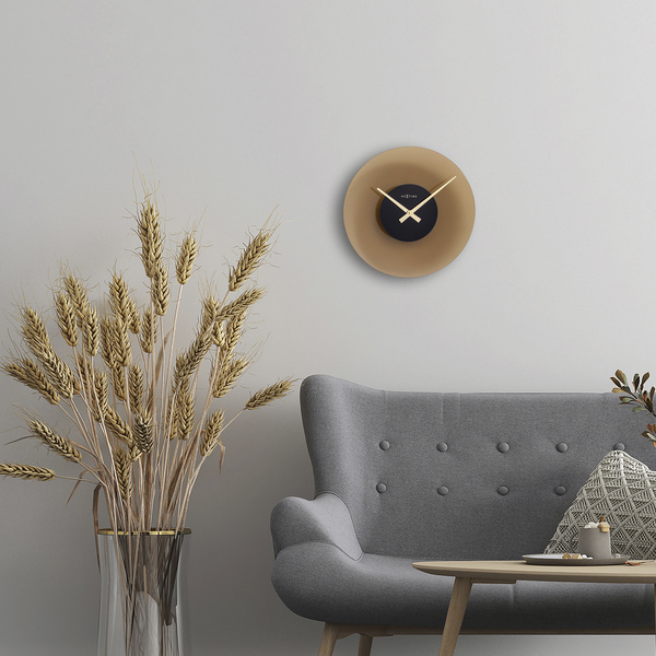 NeXtime’s Float (40cm) is een echte designers wandklok met glas als primair materiaal. Deze stille wandklok heeft een gebogen achterplaat wat de klok een unieke diepte geeft. De mat bruine achterplaat in combinatie met een zwarte glanzende wijzerplaat en gouden wijzers, creëren een contrast tussen hard en zacht, en solide en ondoorzichtig. Deze wandklok werkt op 1 x AA batterij (niet inbegrepen)
