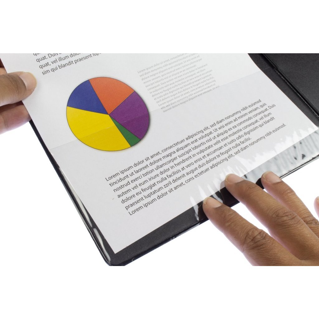 Stevige polyvinylchloride beklede plaat (3 mm karton) met een platte heavy duty clip en penlus. Houdt het papier stevig op zijn plaats en is gemakkelijk schoon te vegen, ook beschikt het klembord over een binnenzak.