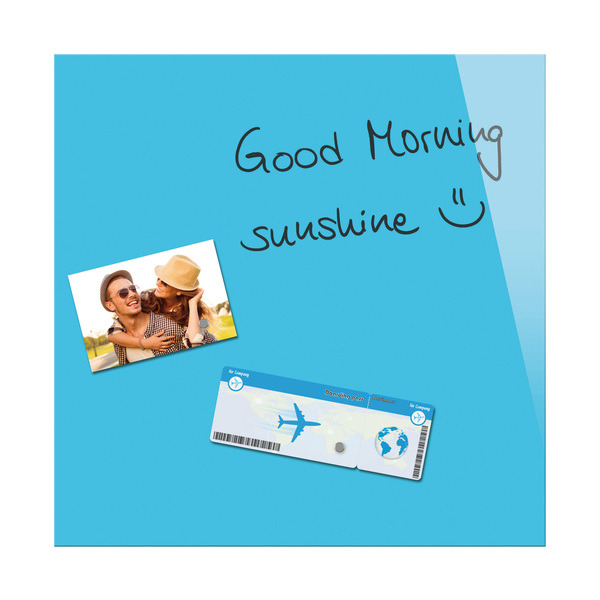 Magneetbord met 2 sterke magneten. Beschrijfbaar met alle soorten krijtmarkers en boardmarkers, Droog en makkelijk uit te vegen. Voorzien van zekerheidsglas naar de norm EN 12150-1. Onzichtbare ophanging, eenvoudige montage. 7 jaar garantie. Formaat 450 x 450mm, kleur blauw.