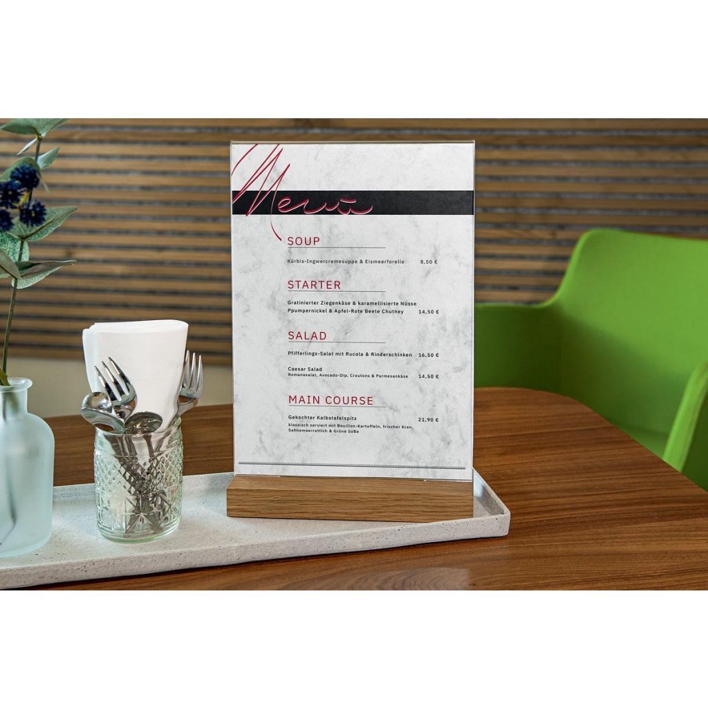 Deze tafelstandaard met massief eiken voet is de perfecte keuze voor degene die op zoek is naar een opvallende kaarthouder voor op kantoor, thuis of in een restaurant. De stevige houten voet zorgt voor een natuurlijke touch en geeft uw tafel een robuuste uitstraling. Maak uw huis, kantoor of restaurant compleet met deze tafelstandaard en geniet van jarenlang gebruiksplezier.