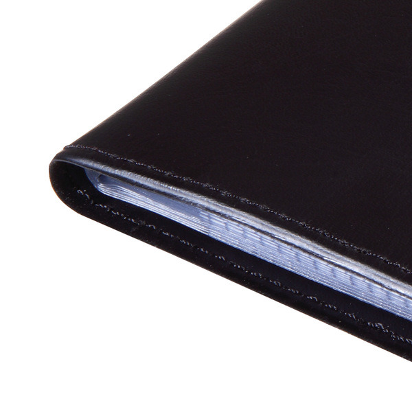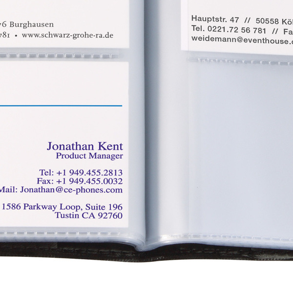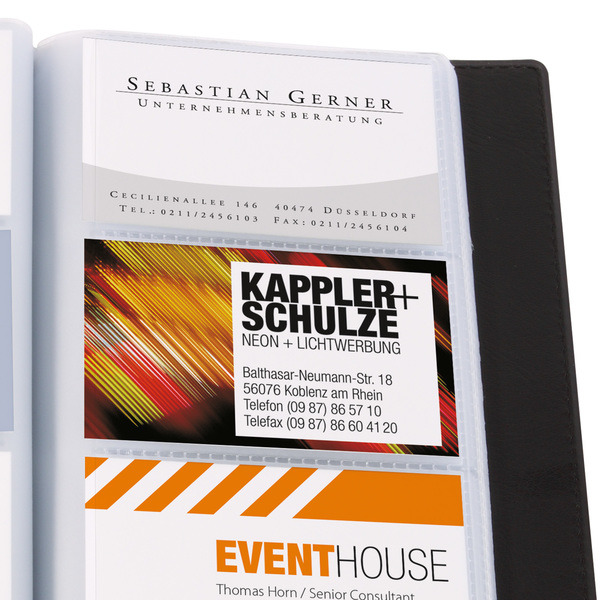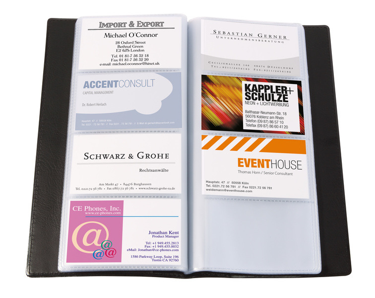 Map voor visitekaartjes in lederen uitvoering. Zwart. Mat. Met 32 doorzichtige showtassen. Kunststof. Voor max. 120 kaartjes (max. 90×58 mm).