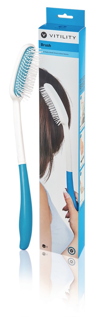De ergonomisch ontworpen borstel zorgt ervoor dat men bij de boven- en achterkant van het hoofd kan komen, zonder de hand, arm of schouder onnodig te belasten. Het handvat is voorzien van antislipmateriaal.