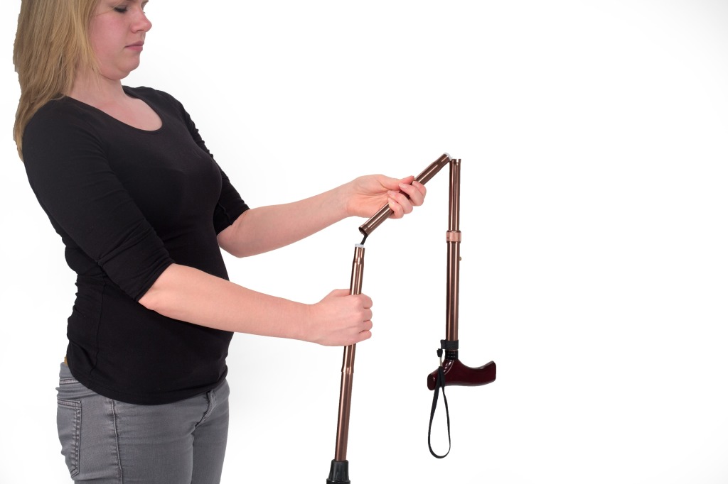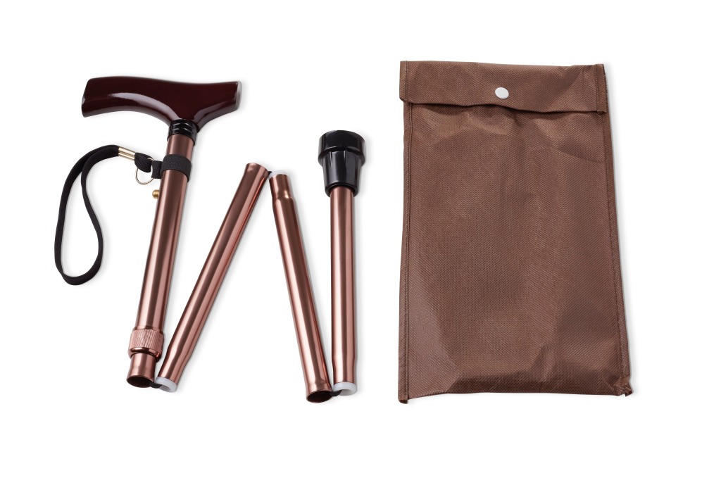De wandelstok kan in hoogte worden versteld en gemakkelijk ingeklapt worden. De wandelstok heeft een houten handvat en wordt geleverd met een opbergtasje en polsbandje.