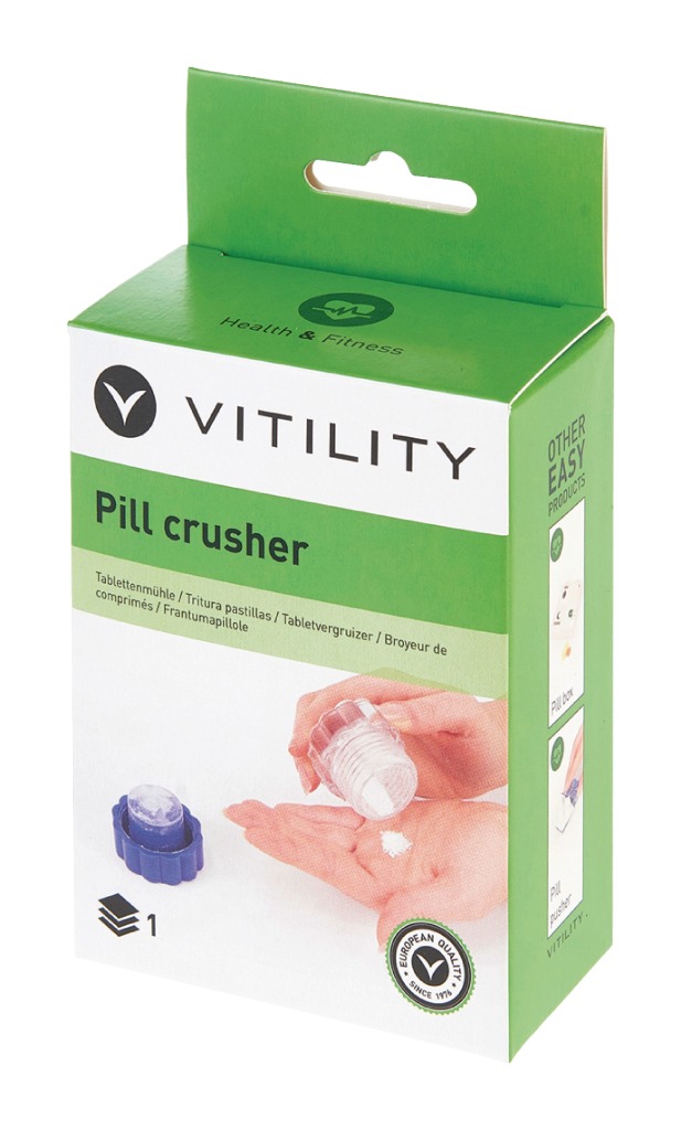 Door de tablet in de vergruizer te plaatsen en de schroefdop aan te draaien, zal de tablet worden vergruisd tot poeder. Extra tabletten kunnen worden bewaard in de deksel. De tabletvergruizer kan gemakkelijk schoon worden gemaakt.