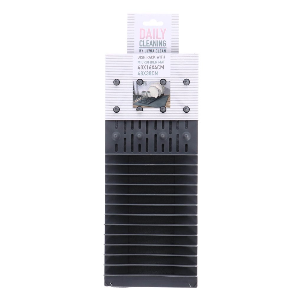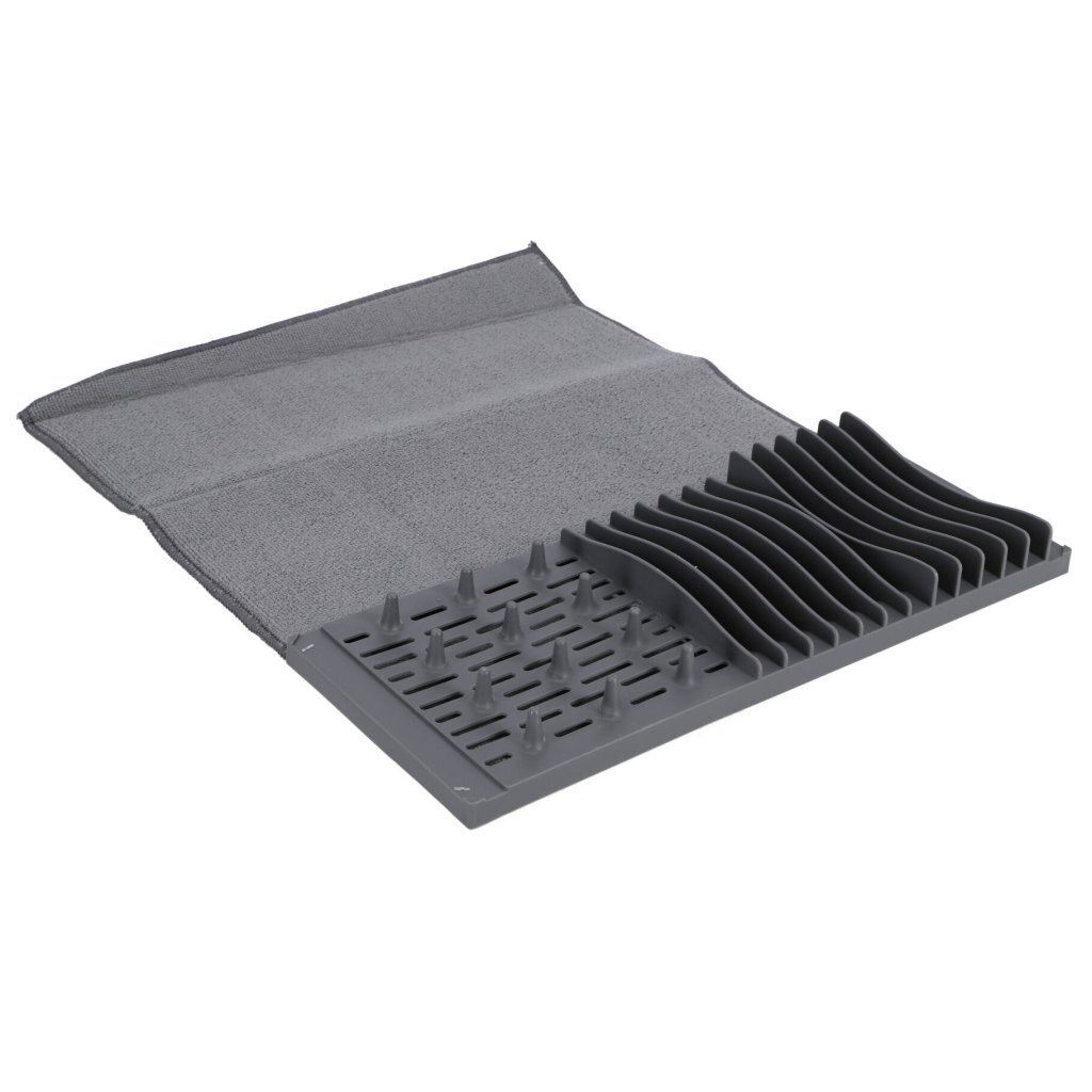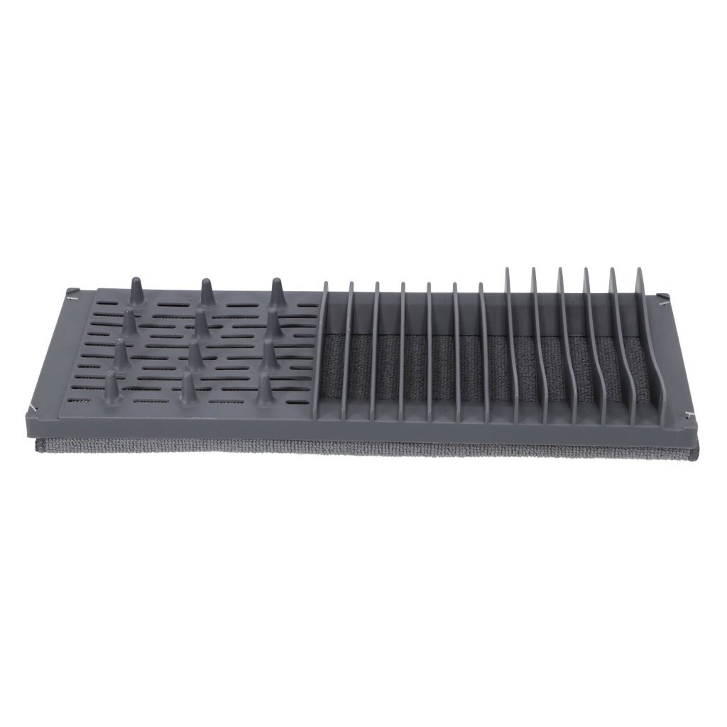 Een afdruiprek op een mat die het water absorbeerd. Het formaat is 38×48 cm, en door het flexibele materiaal is het afdruiprek makkelijk op te bergen of mee te nemen. Kleur: antraciet.
